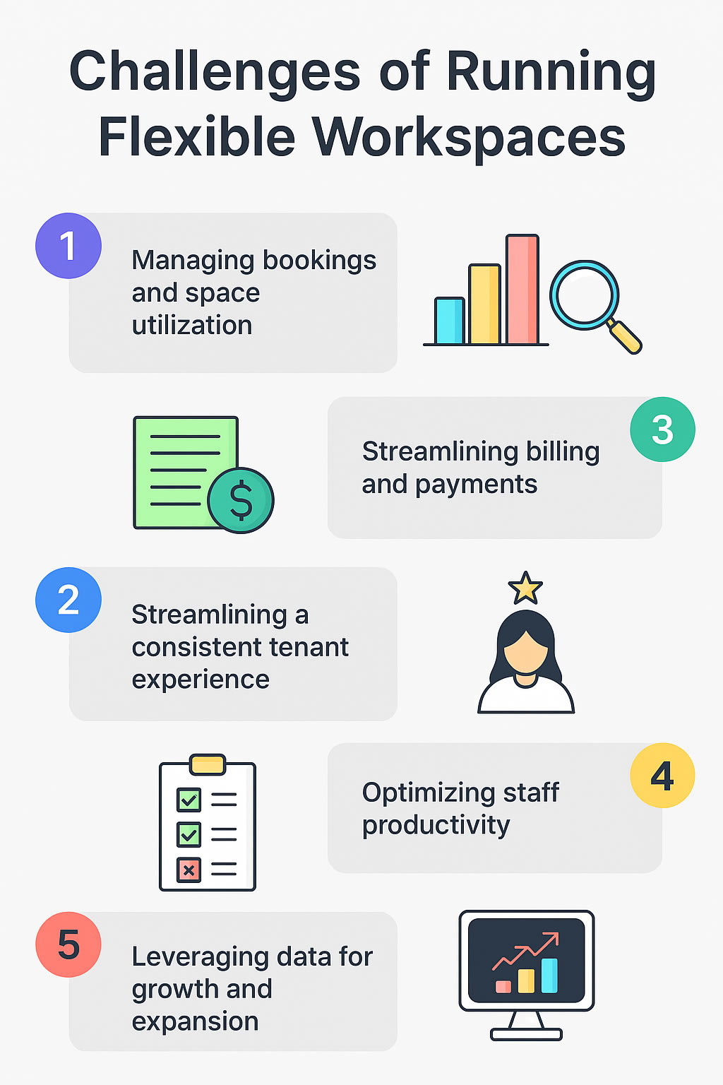money and frustrate tenants. Flexible workspaces often offer multiple membership tiers, hot desks, private offices, and conference rooms—all needing real-time management.